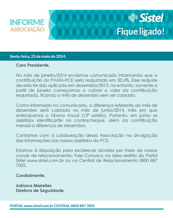 SISTEL INFORMA SOBRE DIFERENÇA DE REAJUSTE DA CONTRIBUIÇÃO PAMA-PCE