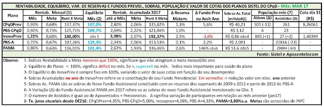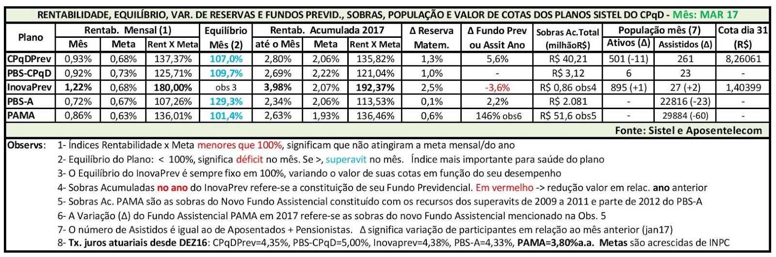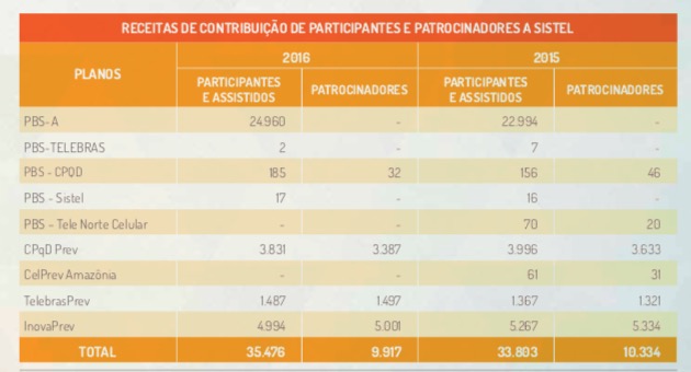 - dos 6 grupos de patrocinadoras somente o grupo CPqD (com 85% da receita) e Telebrás (15%) contribuíram com os planos da Sistel em 2016;